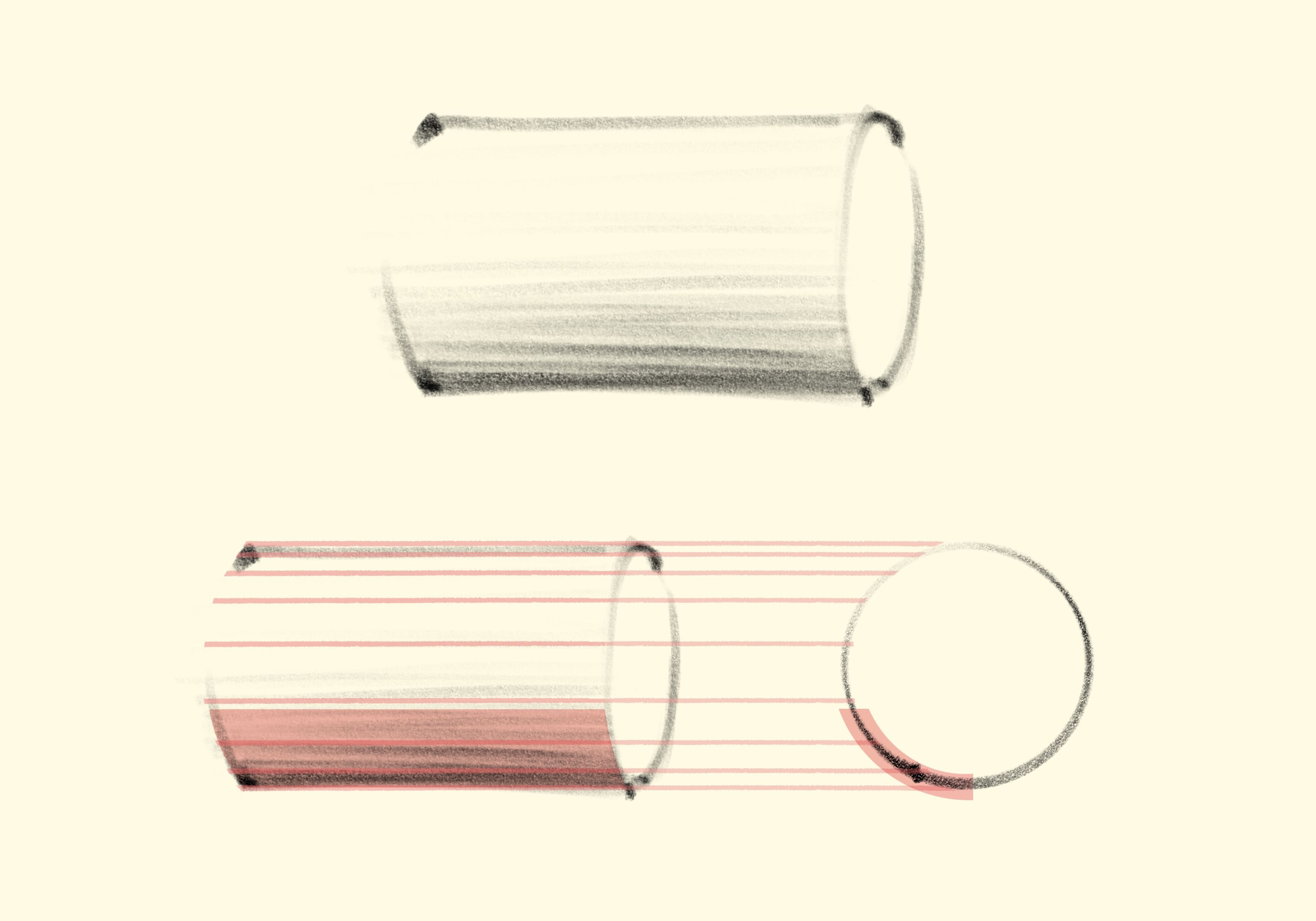 Imagine a lying cylinder. If you had to shade it, which way would you draw your lines? Most of you would instinctively choose horizontal curved lines that wrap around the cylinder.