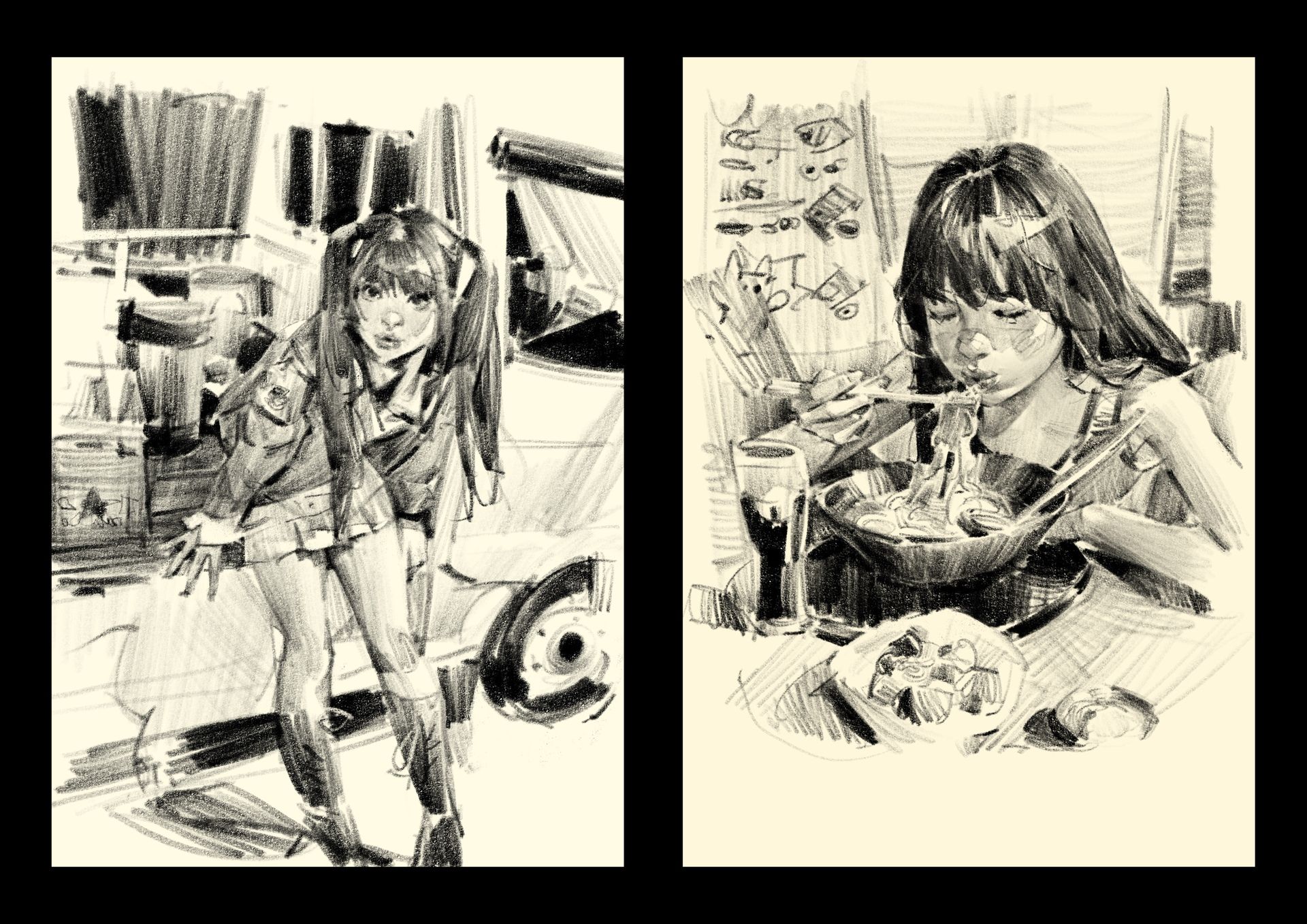 Example from my process — where I tend to draw the head slightly larger than in reality, focusing more on expression than proportion.