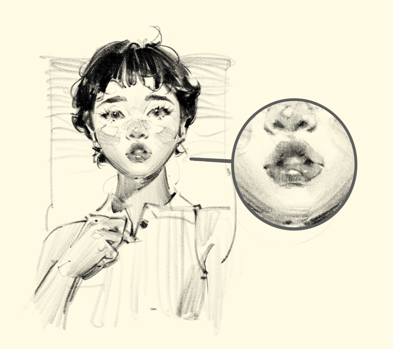 A trembling or broken stroke, or one that pulls back slightly, can create a sense of fragility or emotion. It often appears around expressive areas — the mouth, eyelids, hands. → Example: soft vibration around lips, hesitated mark near the eye