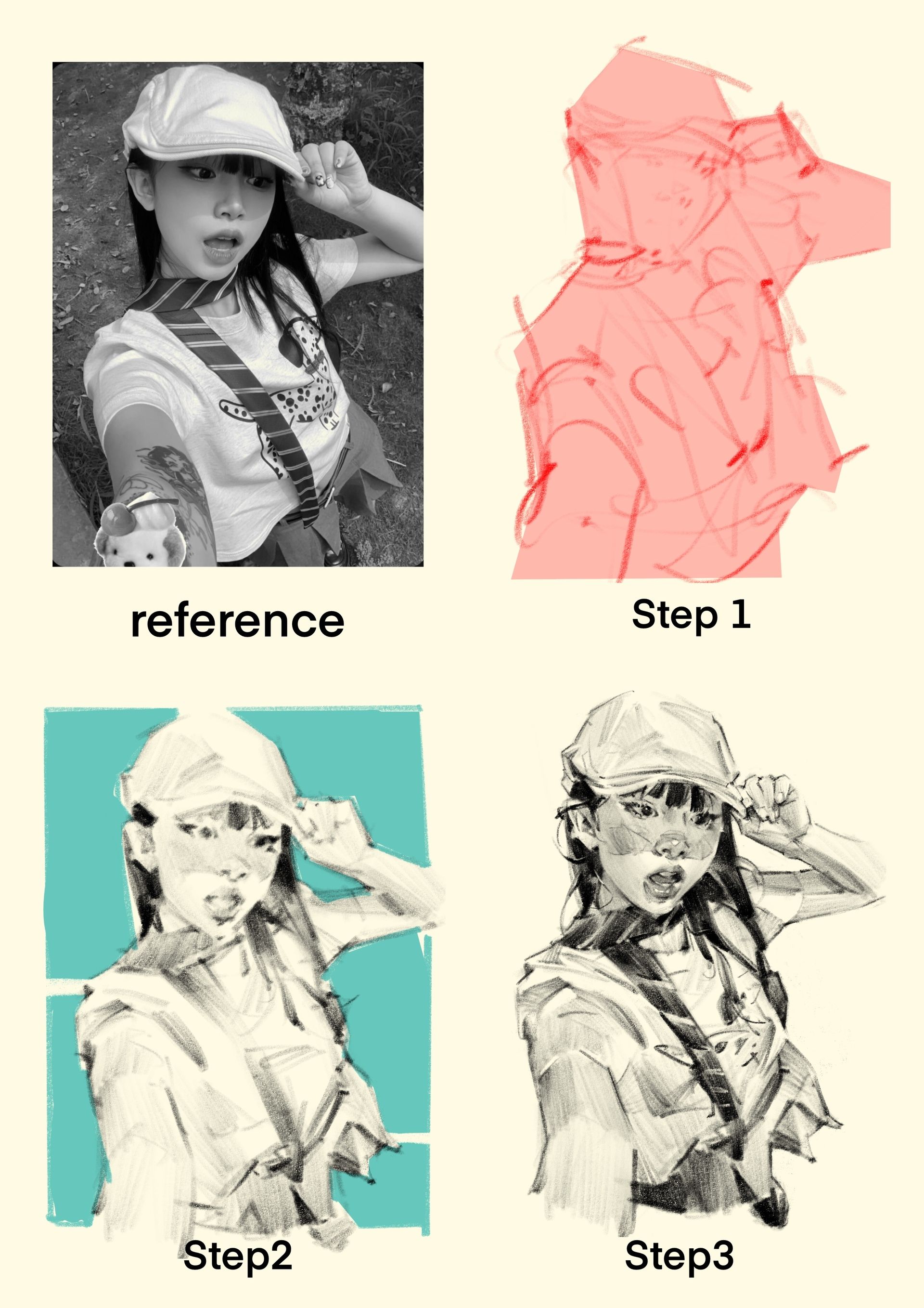 In Step 1, I start loosely with guide lines based on the overall figure.